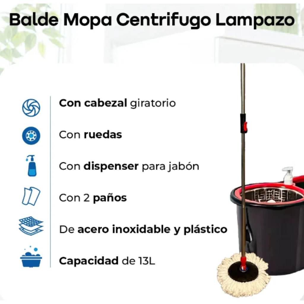 Optimiza la limpieza de tu hogar con la Mopa Lampazo Escurridor Waggs MSK-001, equipada con un práctico balde centrifugador en elegante color negro. Este producto es la solución ideal para quienes buscan eficiencia y comodidad en las tareas de limpieza diarias.